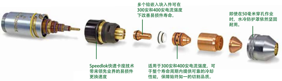 易損件和割槍體的精準(zhǔn)設(shè)計確保精準(zhǔn)鎖定并始終牢固就位。獨立對齊的割嘴和電極確保易損件更換后的卡座同心性同樣精準(zhǔn)。該特性確保使每次的切割質(zhì)量達(dá)到很好狀態(tài)。
