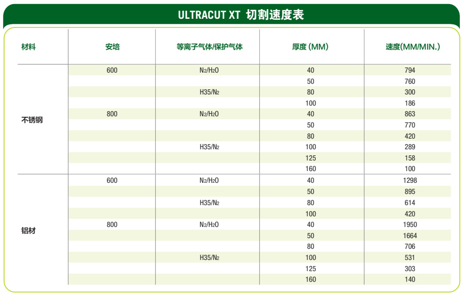 全新推出的 Ultra-Cut XT 600A 和 800A 系統(tǒng)設(shè)計精良,無論在不銹鋼還是鋁材上進行切割,均能“削鐵如泥”,生產(chǎn)切割厚度可達 160 mm。得益于切割功率的大幅提升,在較薄板材上也可實現(xiàn)更快的切割速度,不但提高了生產(chǎn)效率,而且降低了切割成本。利用現(xiàn)有的 UltraCut 300 XT 或 400 XT 電源,再輔以久經(jīng)考驗的各類附件,安裝也更加簡單明了。